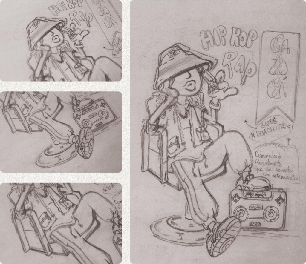 Ilustración digital compuesta por colores planos, trazos en línea, texturas y una tipografía expresiva, que resalta las historias, identidades y resistencias que el rap y el hip-hop mantienen vivas en la zona.