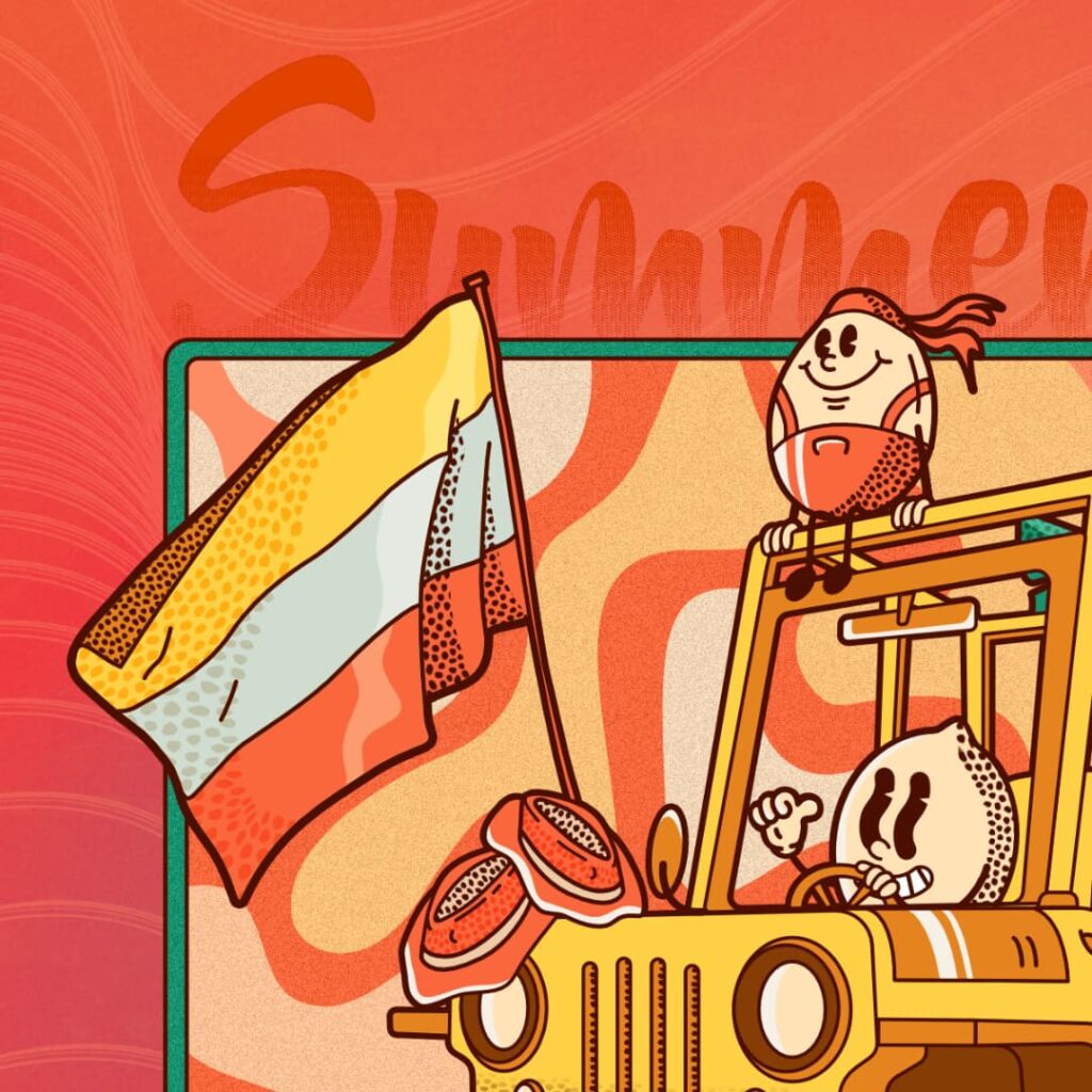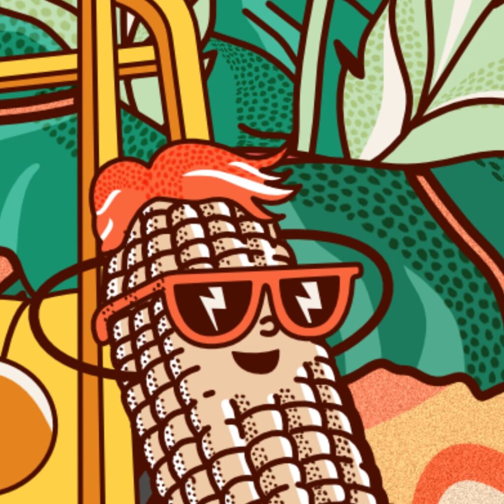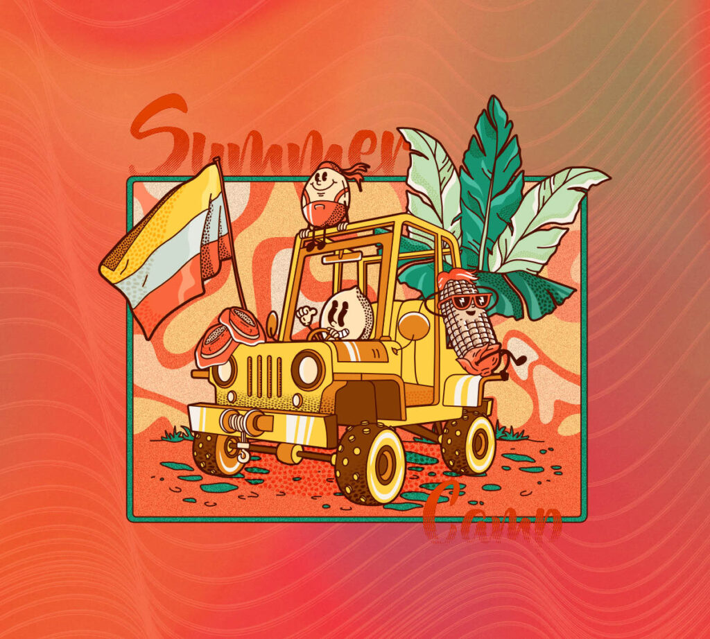 El resultado es una exploración creativa que toma como punto de partida elementos de la vida cotidiana en Colombia —frutas, vehículos rurales, paisajes— para transformarlos en un relato visual con identidad propia, por medio de colores planos, formas geométricas básicas, entramados, textura y un estilo vectorial limpio.