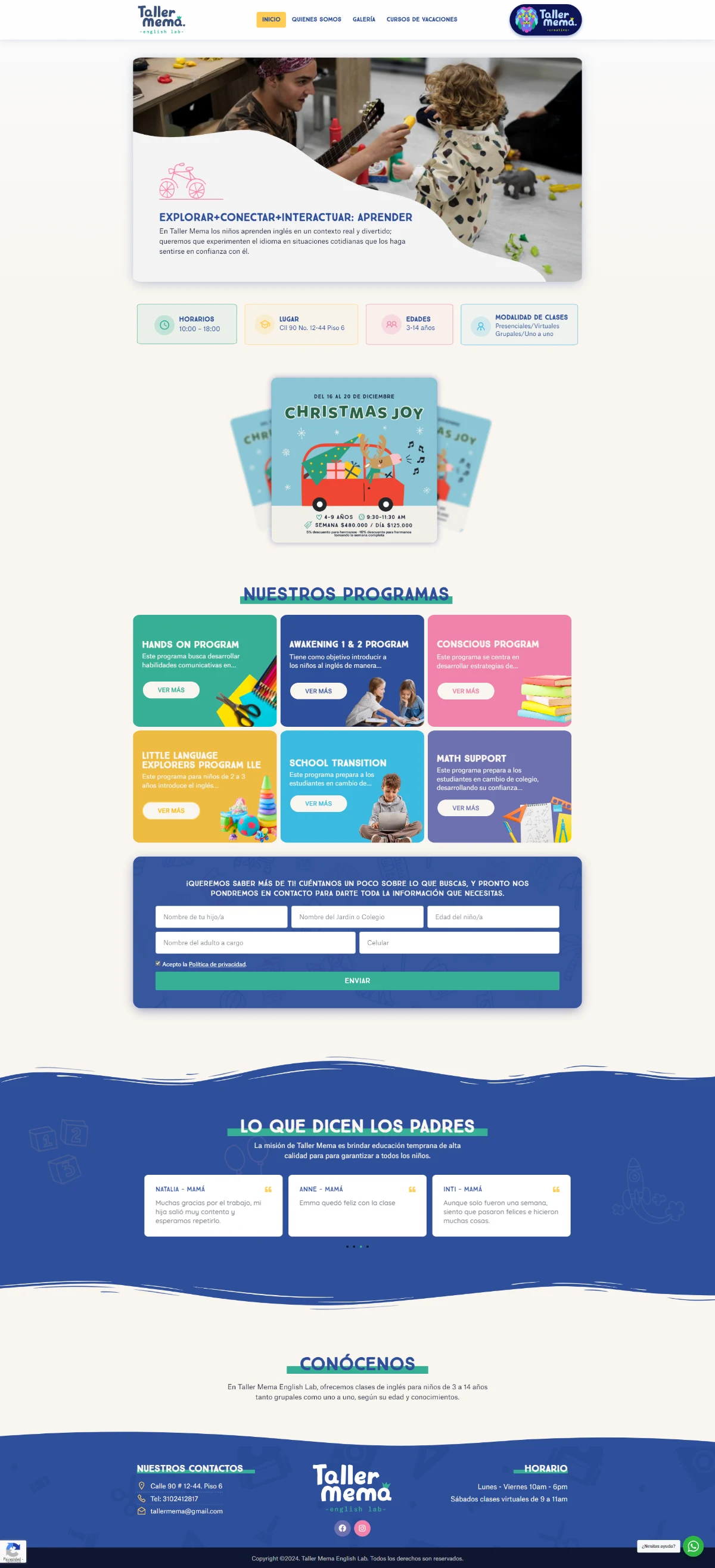 Taller Mema es un espacio diseñado para que los niños aprendan inglés en un contexto real y divertido; donde puedan experimentar el idioma en situaciones cotidianas que los haga sentirse en confianza. Aunque las clases y eventos se dan en un espacio presencial, la idea era mostrar los servicios y actividades por medio de una página web. Por eso se ha creado un sitio que reúne los programas, quienes son, experiencias fotográficas, cursos vacacionales y hasta otras líneas comerciales que trabaja Taller Mema.